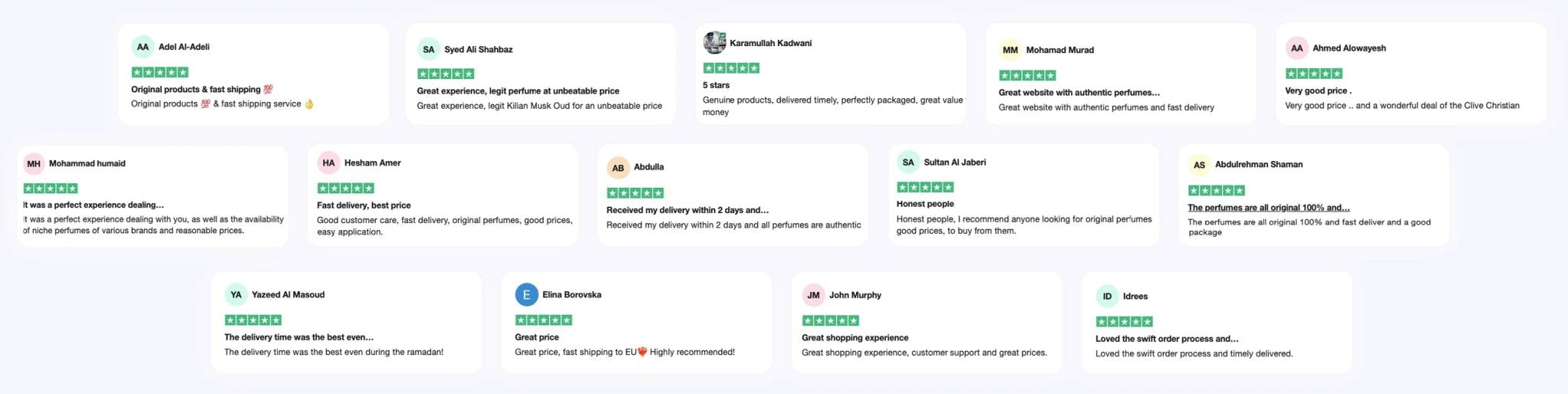 عملاؤنا هم أساس كل ما نقوم به. من التقييمات الإيجابية إلى الطلبات المتكررة، يواصل مجتمعنا من عشاق العطور نموه.